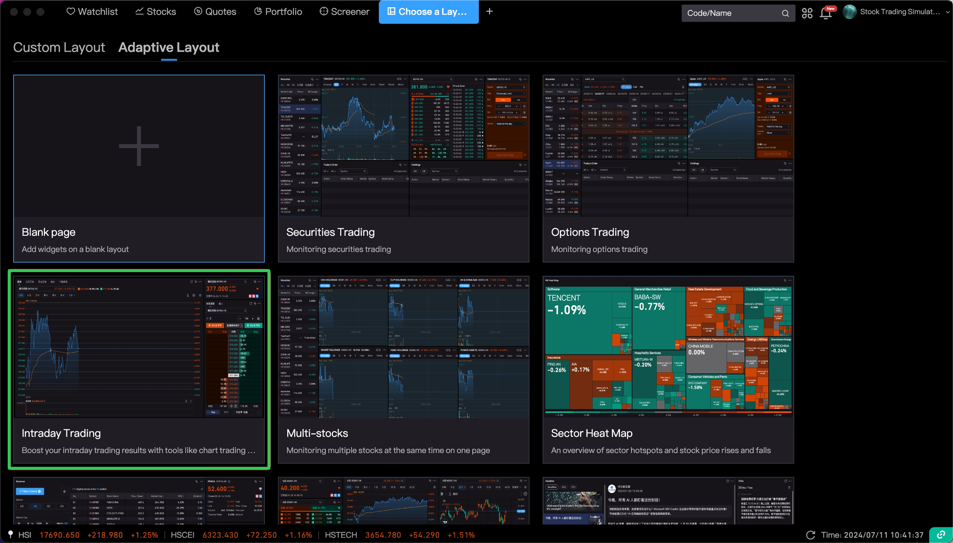 Click on a new tab, select the adaptive layout, and click on 'Intraday Trading'. This panel combines chart trading, depth of market, and orders of the day features and is ready to use directly.