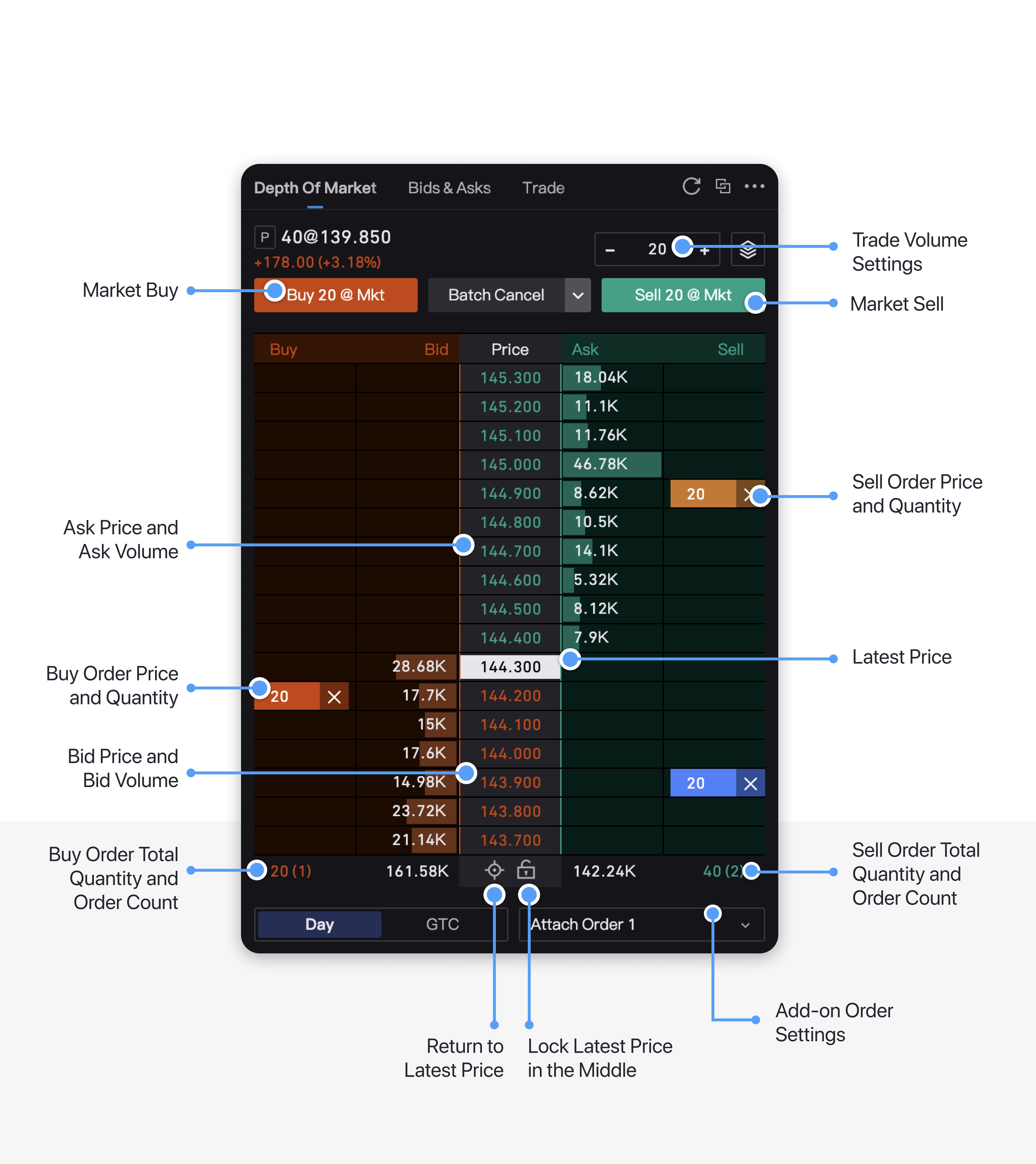 Additionally, Depth of Market (DOM) can be used to help assess the liquidity of a particular security. If a stock has very high liquidity, then there will be a large number of buy and sell orders. Buyers can purchase a large amount of stock without causing significant price fluctuations. Conversely, if a stock does not have strong liquidity, trading will not be as frequent. Purchasing a large amount of stock may significantly affect the stock price.