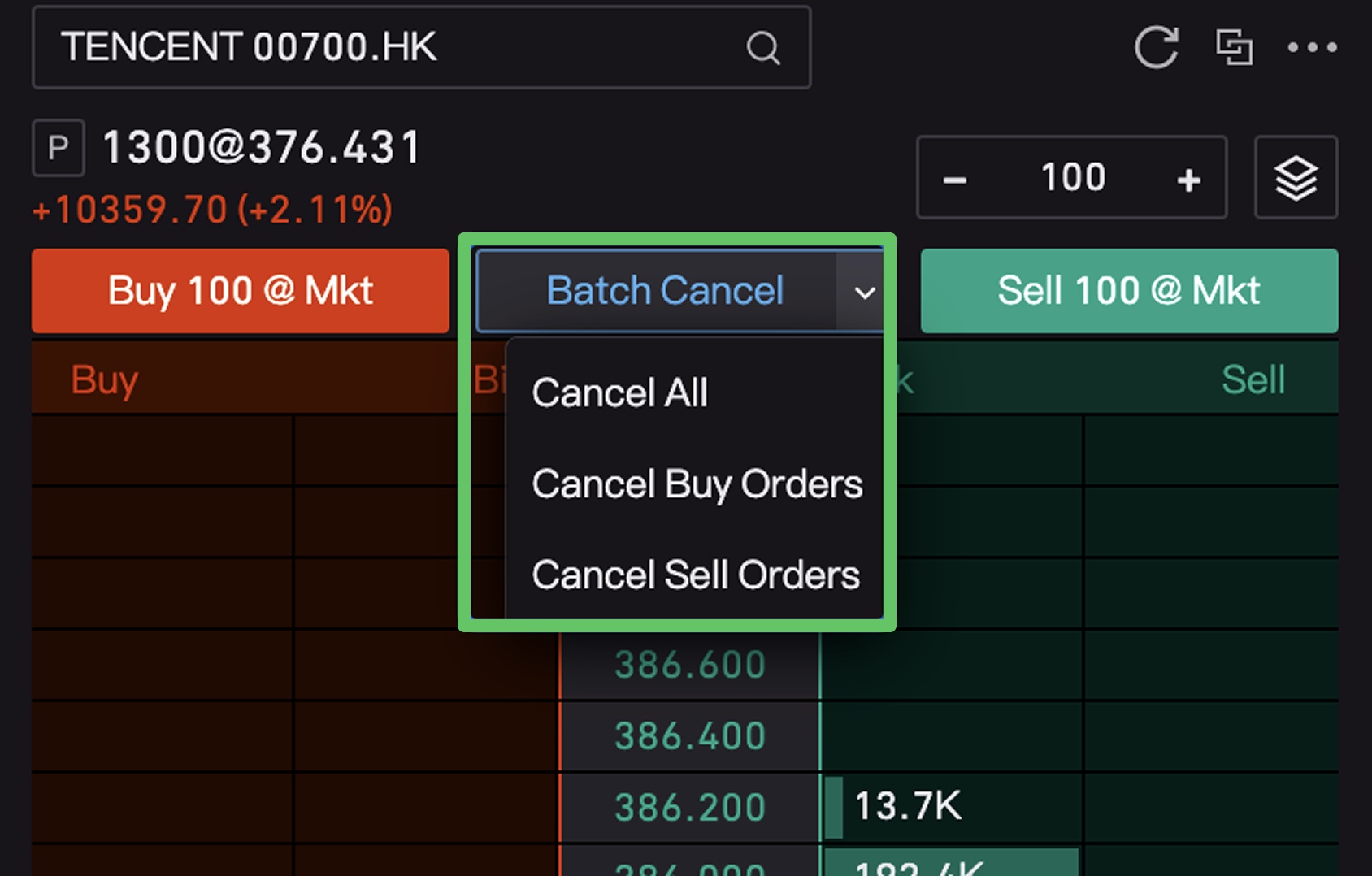 Alternatively, you can click on the header to quickly batch cancel orders, including: Cancel All, Cancel Buy Orders, Cancel Sell Orders.