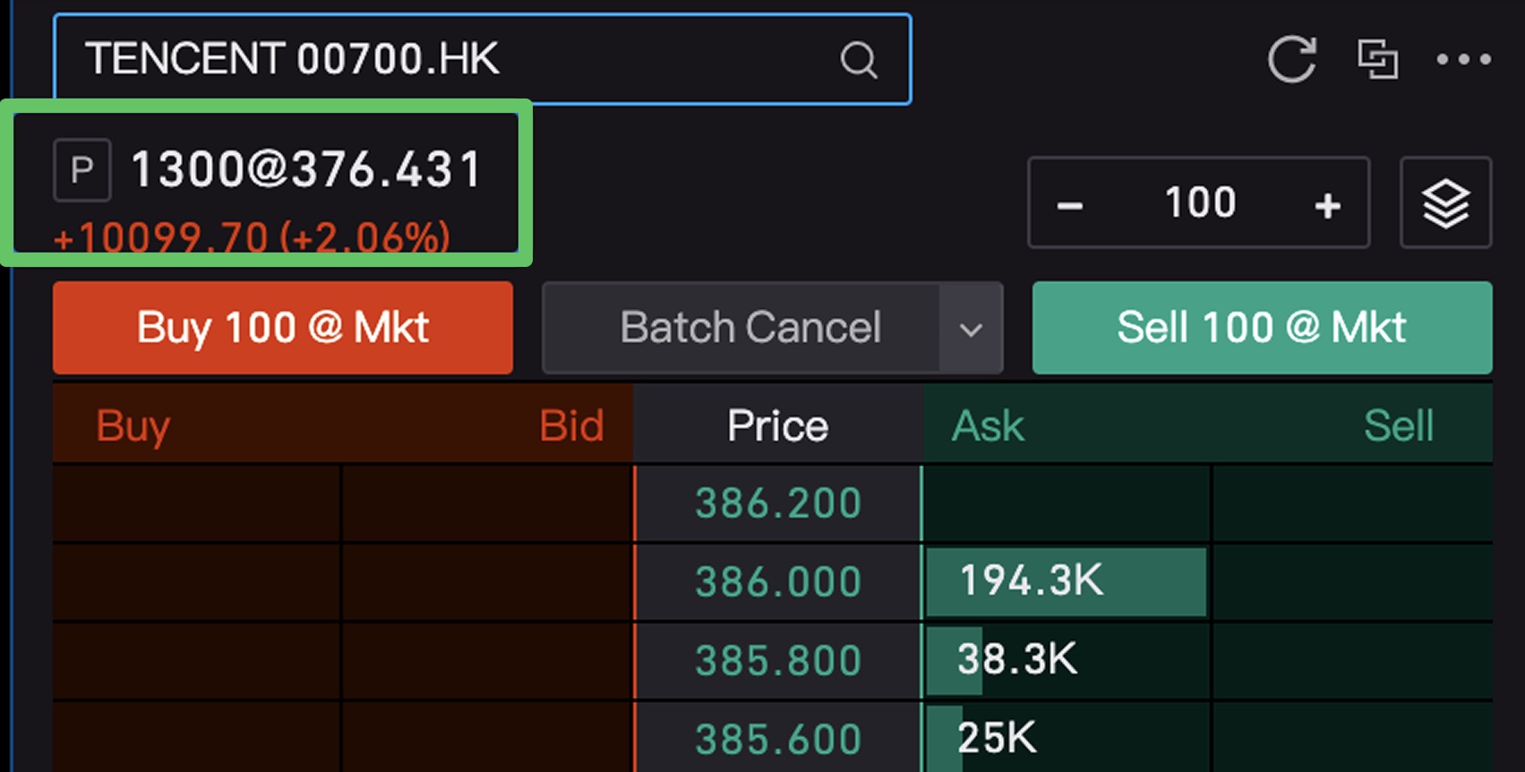 You can view the current stock's position quantity, holding cost, and corresponding profit and loss information at the top.