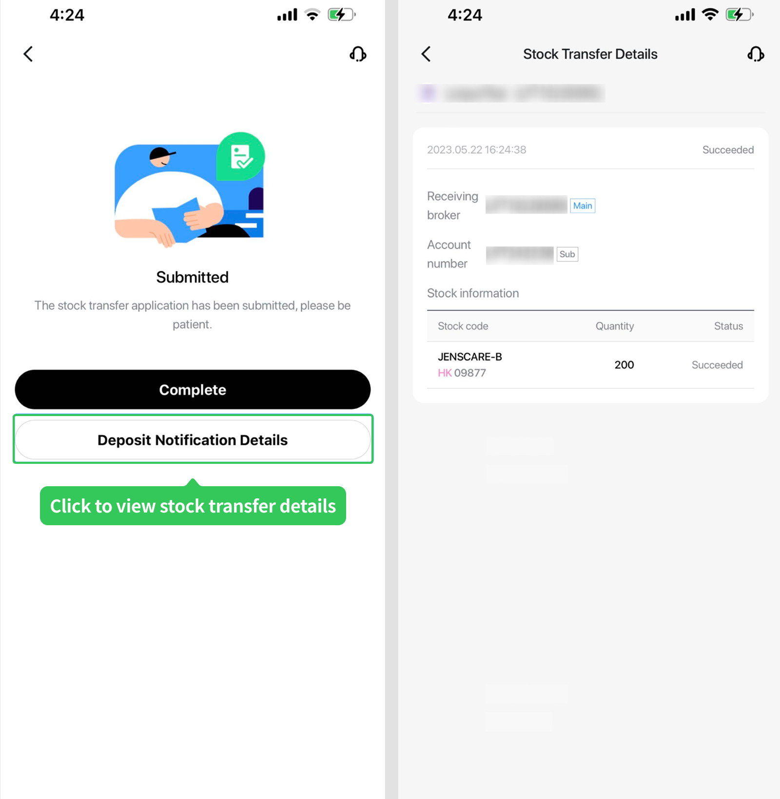 Step 3. If the transfer is successful, you will receive a push notification and email informing you that the stock transfer has been completed. You can also check the transfer progress on the stock transfer details page.